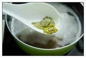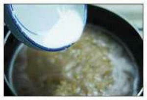 将糯米粉糊一点点倒入绿豆汤中,边倒边搅拌均匀