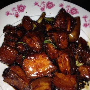 点火上锅,把肉倒入锅中,煸出肥油后,倒入冰糖,继续翻炒,直至冰糖完全融化,裹满肉块。(这是上色)