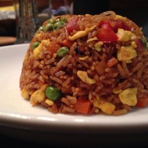 锅里在放油 放入葱煸香 再依次放入胡萝卜 青豆 广味香肠 红椒翻炒 等以上材料炒的差不多熟了 倒入加了酱油的米饭翻炒 最后加入鸡蛋 出锅前加少许鸡精和盐