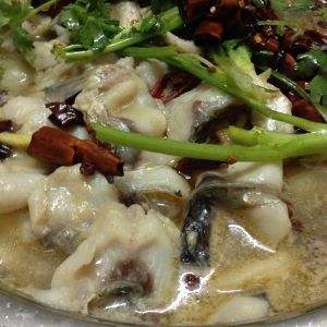 汤汁呈奶白色后,开大火准备下鱼片,不能把整碗鱼片一下倒进去,用筷子一片一片的下,下完鱼片,不要去搅拌,稍等一下鱼片变白,OK了,关火把整个锅里的鱼肉和汤倒在码好麦菜的盆里,缀上香菜,水煮鱼已经初步成型了