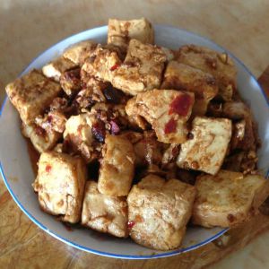 放入少量油入锅,加入豆瓣酱,放入适量水炒匀,再将以煎好的豆腐块倒入,轻轻翻炒待豆腐块与豆瓣酱相融后盛起即可。