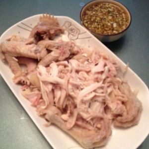 将煮好的鸡捞出 撕碎摆盘 欧了
