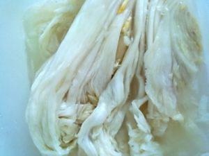 烧开一锅水(要多余3升),取出3升晾凉至温加入菌粉,五勺盐,十勺糖搅拌匀。利用锅里的沸水将大白菜焯水30——60秒后放到无油处晾凉