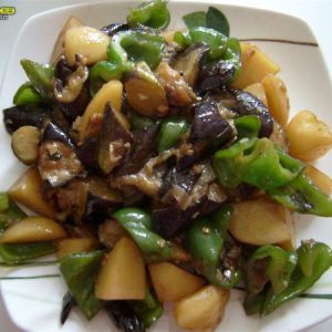 将茄子、土豆过油,放入葱、姜。大概三成熟的时候加上已经调好的汁儿,加入尖椒。