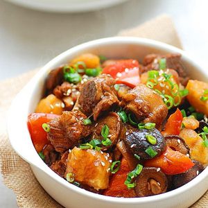 排骨斩成小块,洗净沥干水份。土豆去皮洗净切成块状,泡入水中,以防氧化变黑。红椒洗净切三角形块状。干香菇泡发洗净。