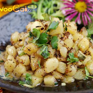 将孜然粉、干百里香、黑胡椒粉、干红辣椒末、姜末和盐混合一起,倒入已七成热的油锅中翻炒一下,然后倒入土豆丁一起翻炒直至入味;