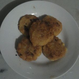第四步:把土豆泥捏成饼状蘸下事先弄好的面糊。放入油锅里煎,煎到两面都焦黄就行了。