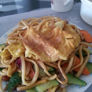 热锅下油翻炒鸡蛋捞出,放入切片的胡萝卜,黄瓜,酱油,面,放入陈醋搅拌面变色,放入熟花生米,捞出扣上鸡蛋即可
