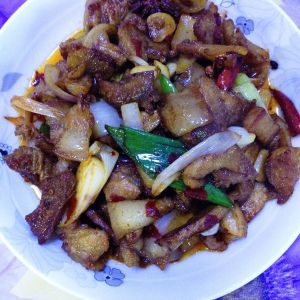 锅热到油,放干辣椒,麻椒,洋葱,大蒜,葱段炒香,倒入五花肉薄片,肉片翘起倒入一勺郫县豆瓣酱,加盐,白糖,