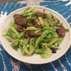 掺水翻炒一会儿,看自己喜欢吃的生熟程度起锅入盘,个人建议青色的包菜比较爽口。太好吃了~