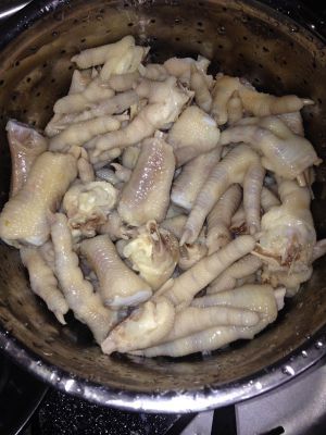 加入水煮开,煮到用筷子插看皮软了就可以了,捞出来用冷水泡泡,这样热冷交替,鸡爪就更有嚼劲