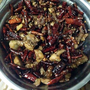 锅中留底油 下入生姜粒、蒜粒、花椒炒香 放入干辣椒慢慢炒出香味下入鸡肉炒到辣椒变色 撒入白砂糖 花生米(我直接放的酒鬼花生)炒匀出锅 ,超级香的诺!