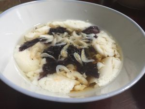 20分钟后,把豆腐花用勺子盛到碗里,加上:配料(榨菜丝、紫菜、虾皮、酱油、辣油、香菜),开吃咯……
