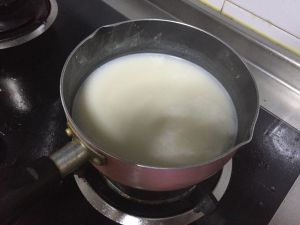 85度左右的豆浆水倒入已化开的内脂水中,略微进行搅拌(划2~3个圆即可,不能多搅拌)
