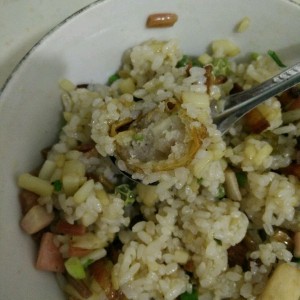 一勺猪油热锅,然后放腊肉炒三四下,然后我又放了个抄手炸熟(因为炸抄手很好吃!!也可以不放猪油,直接倒清油,但我觉得放点猪油炒出来香些)