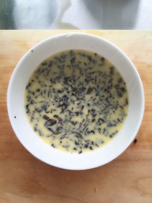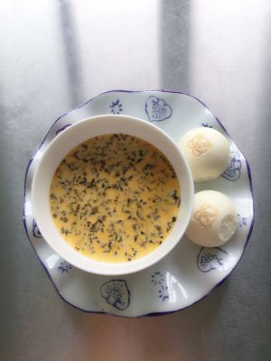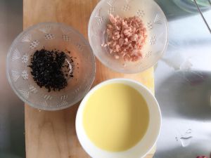 将鱼肉和紫菜加入蛋羹内,先放鱼肉,后蛋羹表面撒上细碎紫菜。