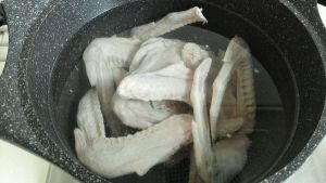 煮开后转中火在煮5分钟关火。倒掉锅里的水,鸭膀用冷水冲洗干净,并且剪成两段备用。