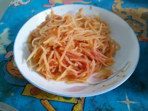 炒锅里面烧热,放油把土豆丝和西红柿一起倒下去翻炒10分钟,之后放点孜然,可以放也可以不放的。一盘美味而又下饭的西红柿土豆丝就做成了!