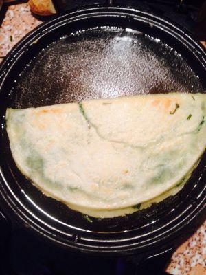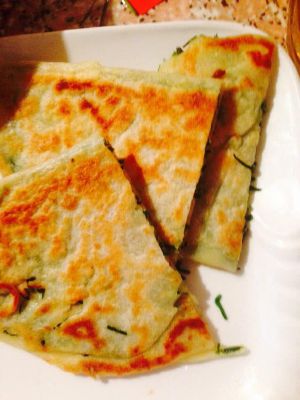 做馅,韭菜切小段,放入碗里加葱末盐味精,油调匀,电饼档加热