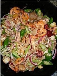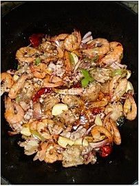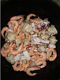 将之前煸炒过的鸡翅、鱿鱼、青虾倒入锅中翻炒1分钟