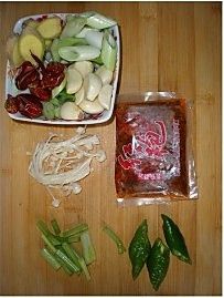 葱段、姜片、蒜瓣、灯笼椒,大红袍的火锅料、金针菇、芹菜、青椒、洋葱(忘记拍了)