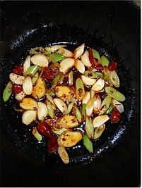 倒入蚬子、鱼丸翻炒1分钟,添少量的水中火焖制6分钟