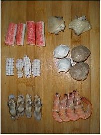 蟹棒、鸡翅、鱿鱼、鱼丸、蚬子、青虾 --------处理: