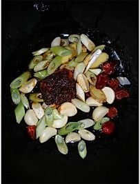 重起锅,倒油,放入火锅料、葱段、姜片、蒜瓣、灯笼椒,小火煸炒