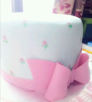 紫红色干佩斯做个蝴蝶结,用清水沾在蛋糕胚边下面,紫红、绿色素画好小花图案