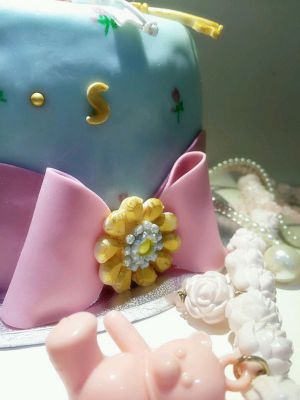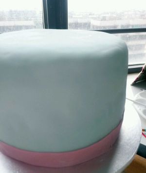 蓝色翻糖膏擀平擀圆,包裹好蛋糕胚,轻轻用干具磨平,底部拥紫红色干佩斯包边