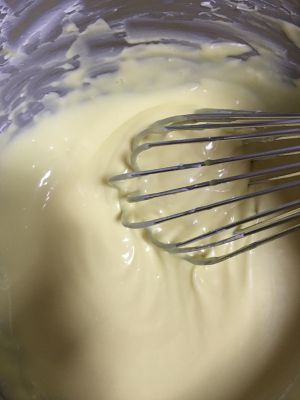 蛋清和蛋黄分离,将3个蛋黄分3次加入步骤2中,每次加入后都要搅打均匀。蛋清盛在无水无油的碗中备用。