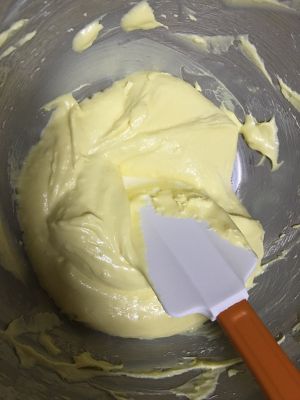 蛋白糊分2次和蛋黄糊融合,用刮刀翻拌均匀,不能搅拌,搅拌会消泡。