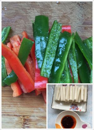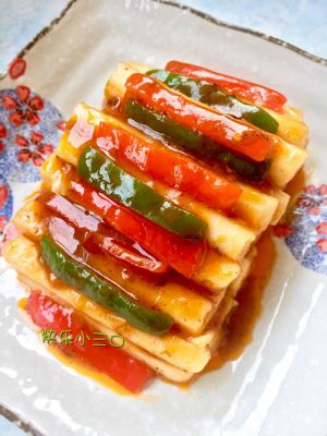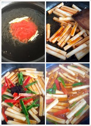 锅中倒少量油放姜丝煸香,放番茄酱年糕翻匀,倒入一小碗高汤煮开,放盐青红椒豆豉,盖锅焖两分钟放鸡精即可!(年糕不吸油,少放油)