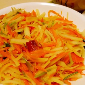 方法一:先放胡萝卜翻炒,胡萝卜只有和油充分结合才能保留他的维生素。五成熟后放入土豆丝。