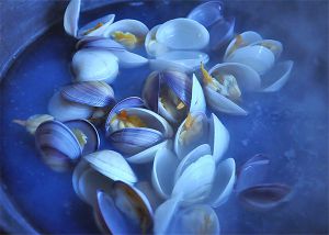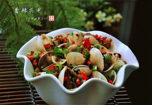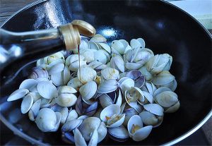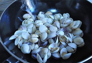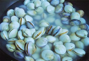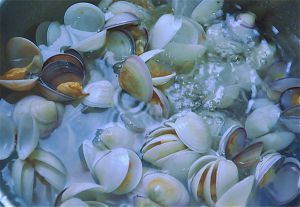 选择白色贝壳的蛤蜊,这种蛤蜊沙比较少,买回来的蛤蜊放在清水中泡一泡数小时进行吐沙。然后把吐沙后的蛤蜊放进热水锅中焯水