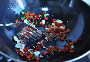 加入盐、葱花和刚才被炝炒过的一部分辣椒、花椒、生姜等材料翻匀,即可出锅装盘