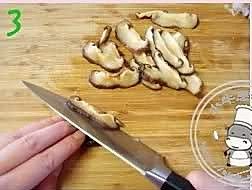 冬菇加入清水泡软后,去蒂切成较薄的片,胡萝卜适量切丝;