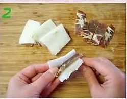 将金华火腿尽量切成薄片,洗净沥干,每片冬瓜中间夹上一片火腿肉;