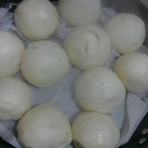 揉馒头。把大面团放一些实用碱面,揉均匀。在把面团分成等额一个个小分,揉成馒头模样。