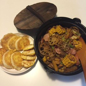 加入超市买的香锅底料,爆香。再把白菜和土豆条放入翻炒。