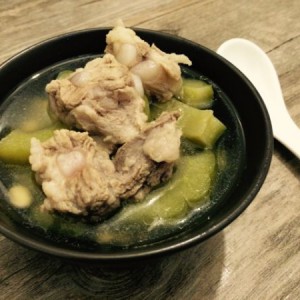 取一汤锅,放入焯好的排骨,切厚块的苦瓜,倒入黄豆,加足量水,大火转小火,饮食前加少许盐