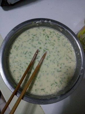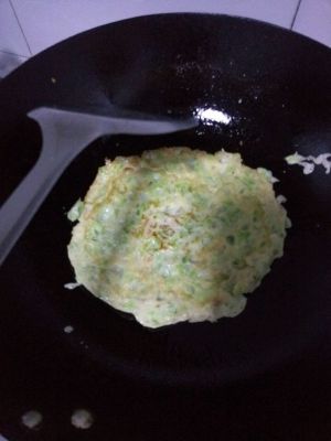 平底锅放油,把面糊盛入锅中,摊平,成型后,翻过来,煎另一面,稍稍煎黄即可。此步骤最关键,如用非电饼铛加热工具,则一定要把握火候,瑾防煎糊。