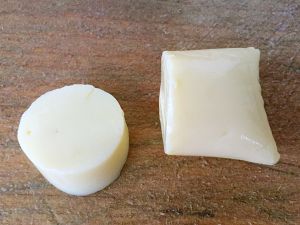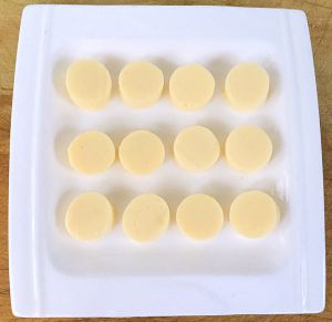 将日本豆腐从中间切开取出外包装切成3厘米高的圆柱体