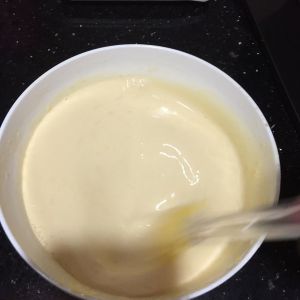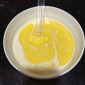 6.黄油隔水加热,将加热好的黄油加入过晒后的千层糊里! 备注:黄油可在过筛前就加入。由于现在天气冷所以我选择过筛后再加入,否则黄油会冷却变硬,导致影响面糊过筛!