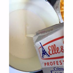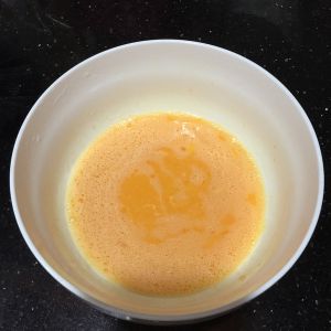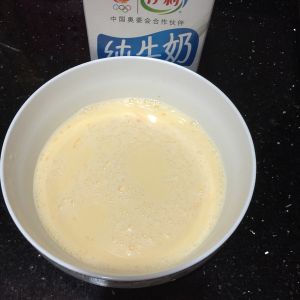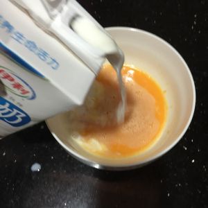 2.把牛奶加入到搅拌好的鸡蛋里面。