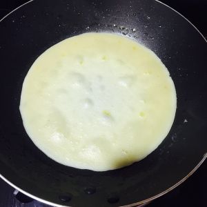 9.把面糊倒入。取一勺子,每张皮都用一勺的面糊,这样煎出来的皮才匀。要注意用小火煎,否则很容易糊。皮不用翻面煎!