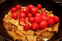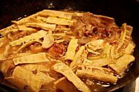 盖上锅盖闷一分钟后,揭开锅盖,倒入适量开水,同时加入已经泡开的扁尖,慢火笃1个小时。