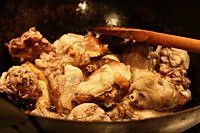 倒入鸭块儿,稍微煸炒一下,鸭肉表皮呈金黄后,喷入少许花雕。