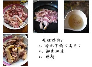 鸭肉洗干净后,加姜片冷水下锅,煮开后撇去血沫,捞起备用。