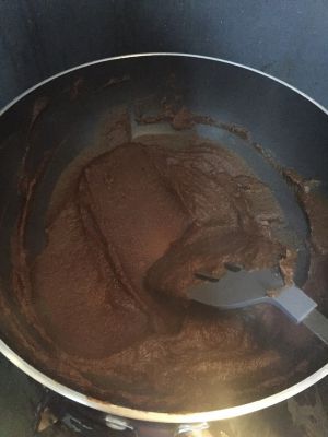 枣泥放入不粘锅,分3次加入玉米油,小火翻炒,直至水分炒干,枣泥渐渐抱团即可。